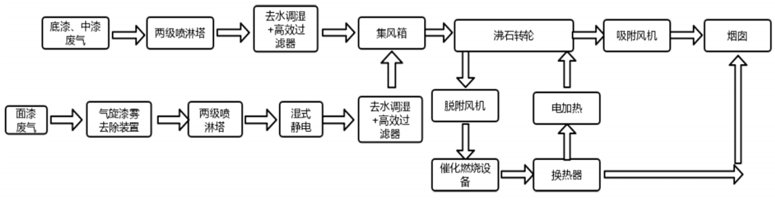 该方案根据产生的废气的不同采用面漆和底漆分开进行预处理,再通过沸石转轮+催化燃烧的处理方法对比传统的方法更具有优势,不仅使 VOCs 去除效率达 98%,废气能稳定达标排放,并且减少了设备的维护成本,节省了人力物力。